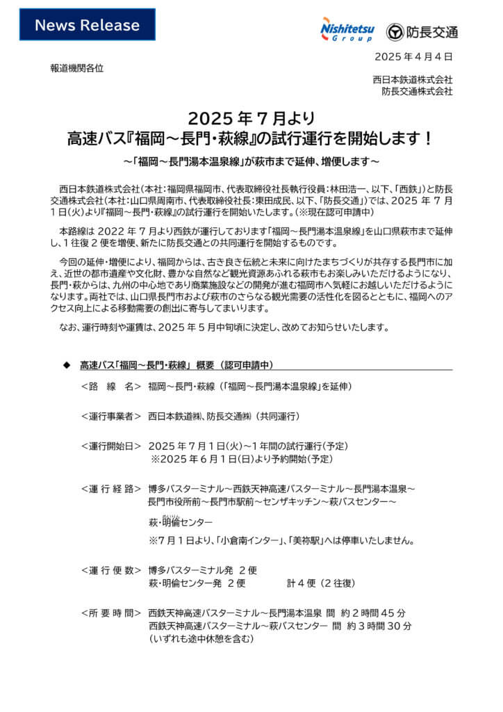 平素より高速バス「福岡~長門湯本温泉線」おとずれ号をご利用いただきまして誠にありがとうございます。 2025年7月より、「福岡〜長門湯本温泉線」は、萩市まで延伸・増便し「福岡〜長門・萩線」として試行運行が開始されることとなりました。詳しくは、下記のプレスリリースをご確認ください。
